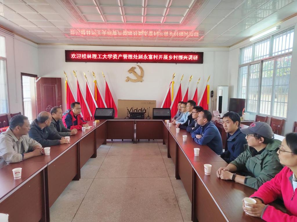 支部全体党员与永富村村委会人员及学校派驻村第一书记杨剑同志进行了深入的交流。座谈会上,杨剑同志详细介绍了驻村工作进展、帮扶项目实施情况以及乡村振兴战略的建设成果。双方围绕永富村的经济发展现状、特色资源优势及产品销售模式与渠道等问题进行了探讨。农庆能同志向与会人员介绍了资产管理处的基本情况,表示将大力支持永富村的特色产业发展,以实际行动助力定点帮扶村全面推进乡村振兴建设。