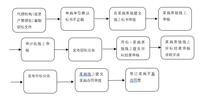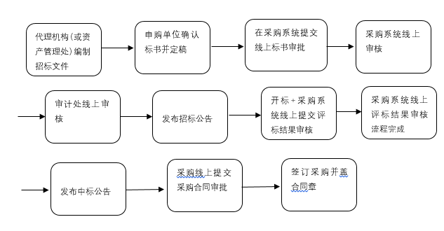 评审结果审批流程:招标科经办人提交(提交评审结果材料电子版)-》项目经办人(确认)-》项目经费负责人审批-》招标管理科科长-》资产管理处分管副处长-》资产管理处处长-》审计处(财务审计科)。