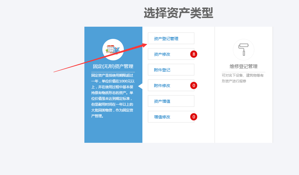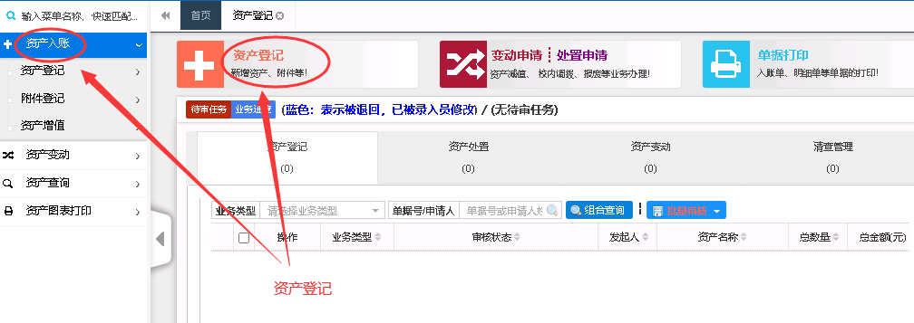 1.在首页上方快捷功能区,点击“资产登记”按钮,即可弹出以下界面;