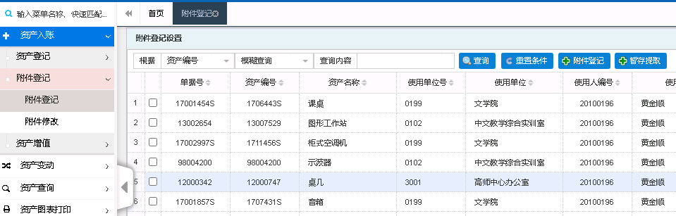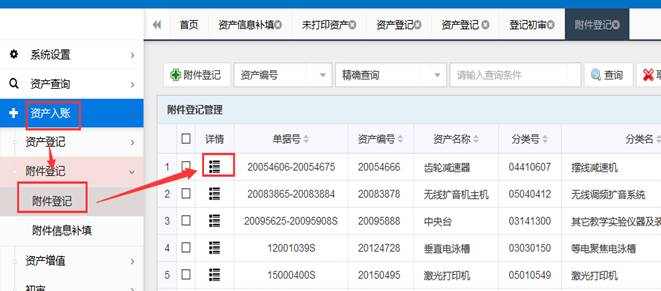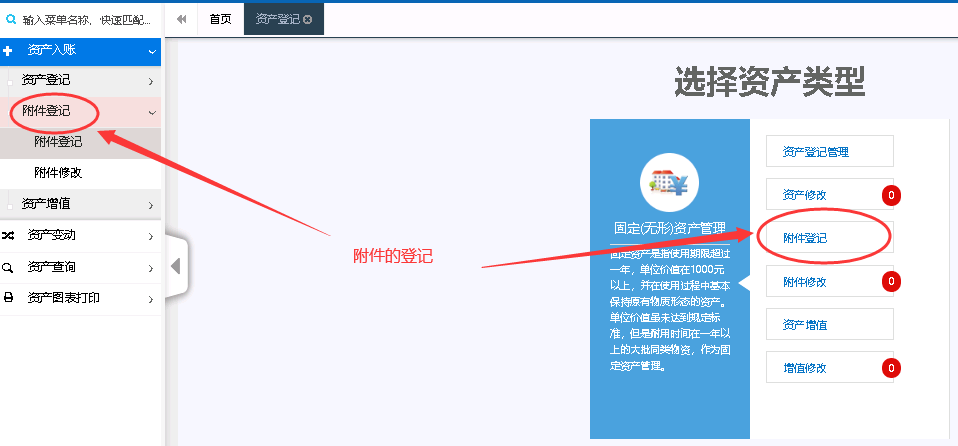 2.在首页左侧功能区,点击‘资产入账’→‘附件登记’→‘附件登记’,即可弹出以下界面;
