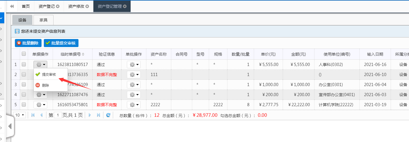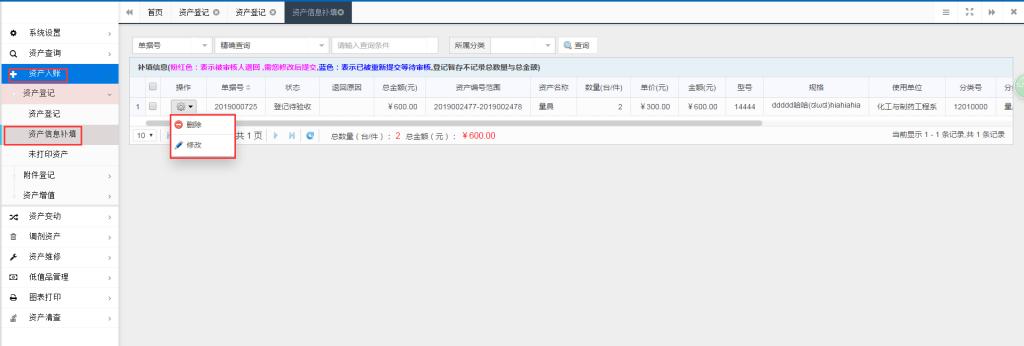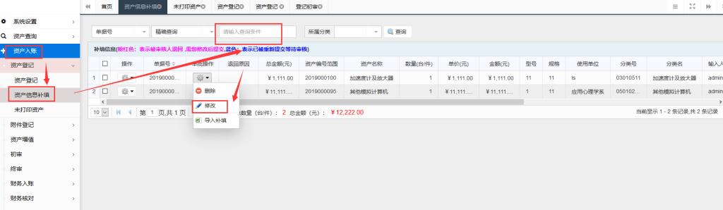 此功能能够对已【提交】但还未审核的资产信息进行修改、删除和打印等操作。操作菜单为:左侧“资产入账→资产登记→资产信息补填”菜单。