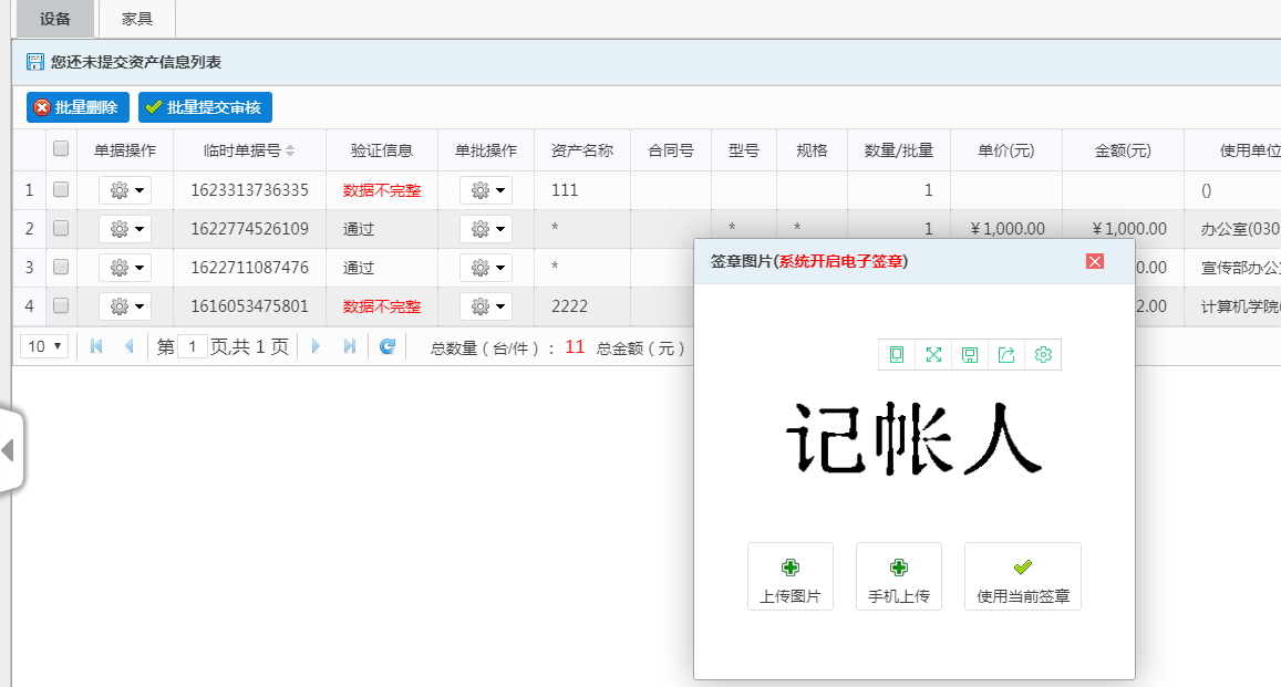 提交审核后会弹出电子签章功能,老师可以通过【上传图片】或者【手机上传】电子签章后点击【使用当前签章】即可