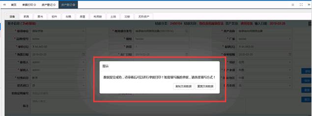 点击【复制页面数据】,将复制本条资产数据至下一条,老师可以在此基础上进行修改使其变为下一条要录入的资产,然后保存提交。