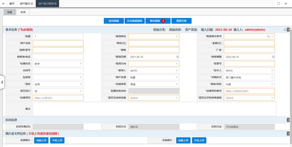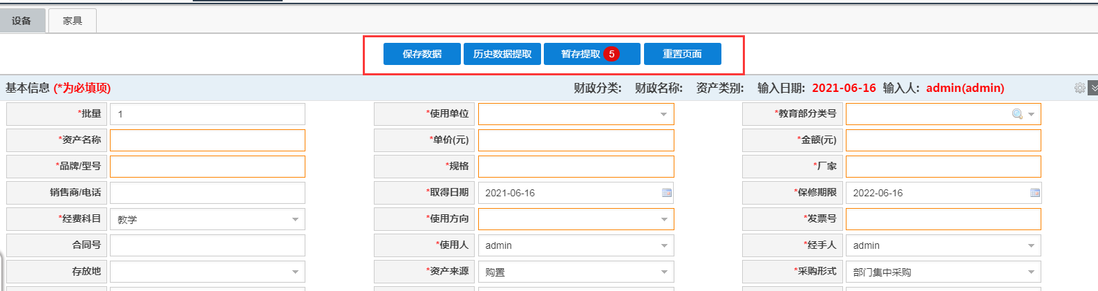 ④【历史数据提取】:可以提取在账资产数据(自己账号录入的数据)至当前要录入资产的页面上,老师可以在此基础上进行修改使其变为当前要录入的资产,然后保存提交;