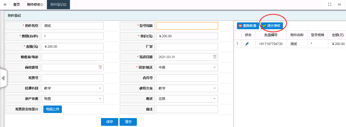 录入资产的批量大于1时,会要求填写附单,附单的内容可以下拉复制,也可以在Excel表中把填写的数据整理好,再粘贴进去,填写完成后保存,继续填写其他必填项,最后保存提交审核。