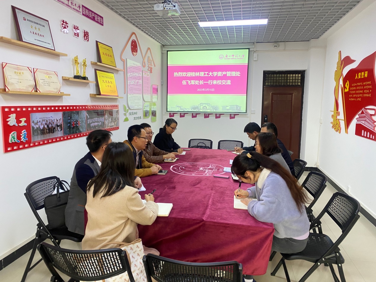 为贯彻落实学校党委行政的工作指示,借鉴兄弟院校在国有资产管理方面的工作经验和做法,3月15日下午,伍飞军处长带领相关科室人员赴广西师范大学国有资产管理处考察交流。